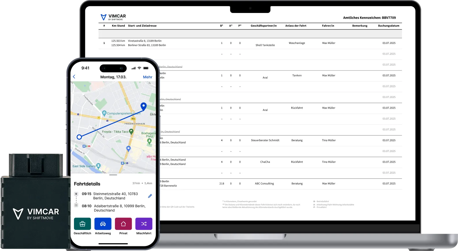 Vimcar nutzt einen Stecker im Fahrzeug, der Fahrten automatisch erfasst. In der App ordnen Sie Fahrten per Klick zu und exportieren sie jederzeit als Nachweis.